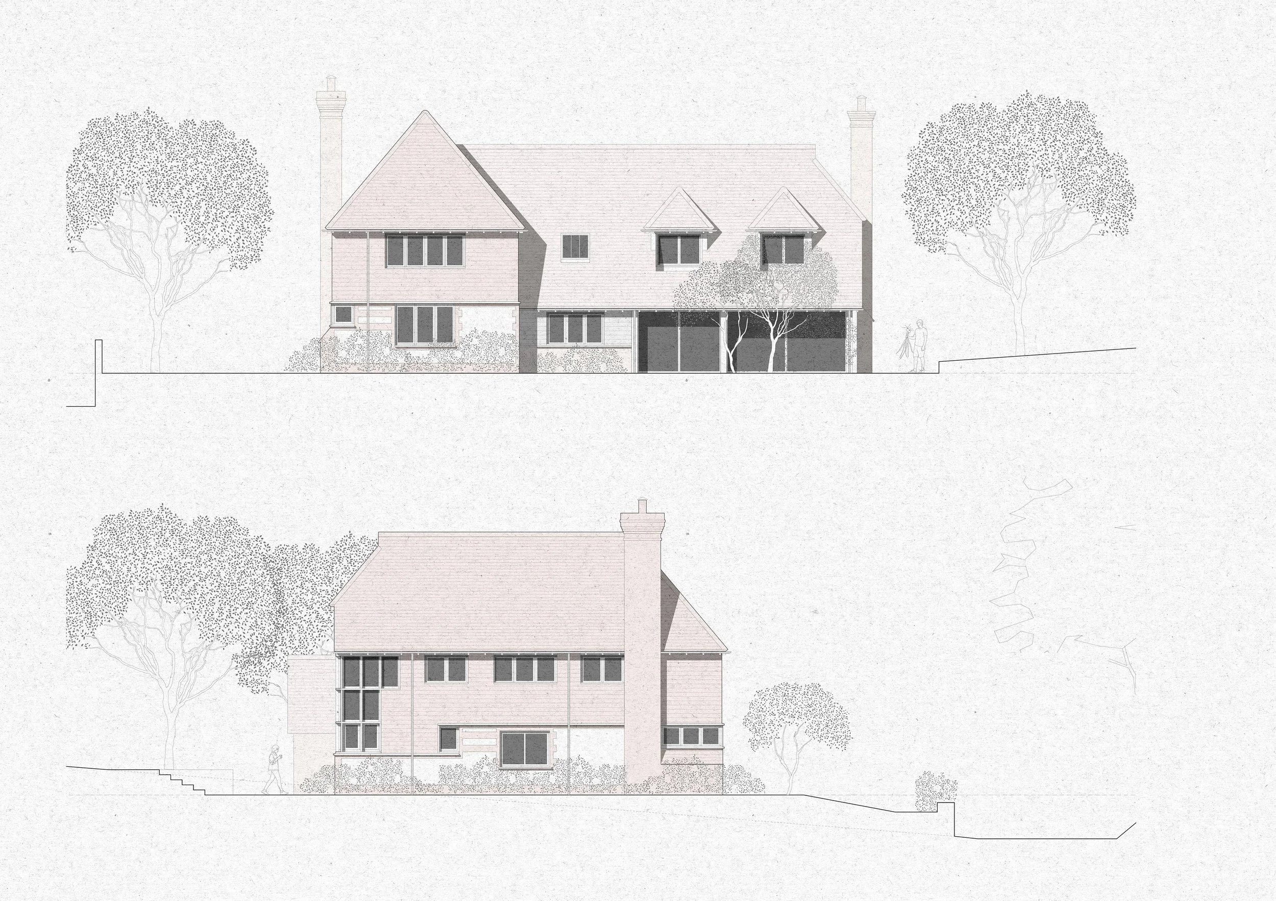 Our key reference points were three listed farmhouses in the village, which shared common characteristics. Our proposal closely follows the form and materials of these houses, though we have opened up the internal layout to make the most of the site’s exceptional views of the South Downs.